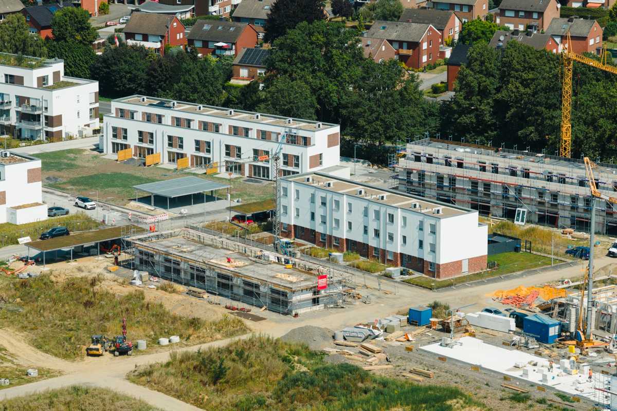 Nachdem die ersten sechs Reihenhäuser im 3. Bauabschnitt fertiggestellt und an die Käufer übergeben sind, geht es mit dem nächsten Riegel weiter. Sieben Häuser in Reihe entstehen an der Münsterlandstraße – ausgestattet mit Luft-Wärmepumpe für nachhaltige Energieerzeugung und behaglicher Fußbodenheizung. Ohne Keller errichtet konnte die Bodenplatte in diesen Tagen gegossen werden. Nun geht es in den Hochbau und die Wände werden in bewährter Massivbauqualität hochgezogen.