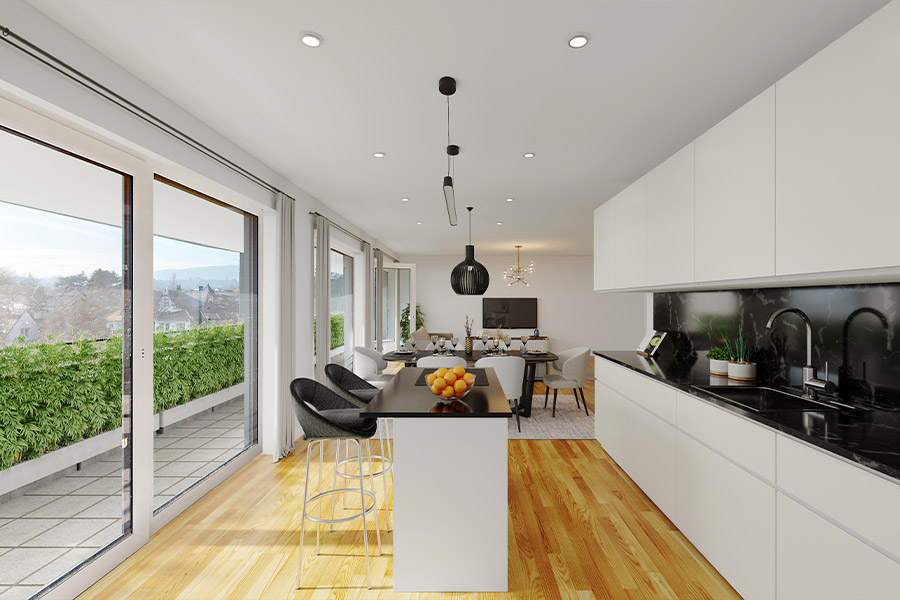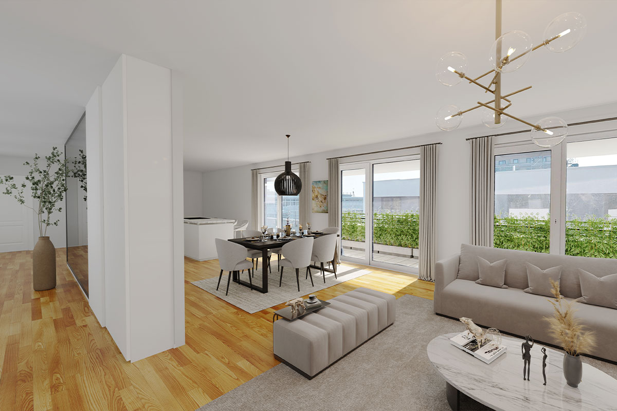 Was die klaren Formen und luftigen Fassaden von außen versprechen, wird in den Innenräumen mehr als eingelöst. Offene Wohnkonzepte und eine moderne Ausstattung sorgen für großzügige Weite. Die fließenden Grenzen vermitteln nicht nur ein angenehm freies Raumgefühl, sondern fördern auch das Miteinander. Die zahlreichen Fenster lassen zudem die Sonne in Ihr Leben und verheißen lichtdurchflutete Stunden. Der breite Wohnungsmix mit gut geschnittenen Grundrissen spricht sowohl Singles als auch Paare und Familien an.