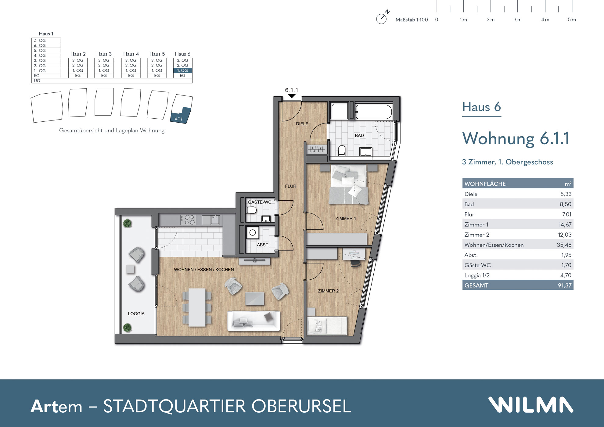 Wohnung 6.1.1 | 3 Zimmer, 1. OG, ca. 91 m² | Grundriss |